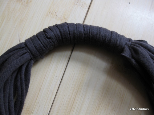 4/3 - a kinyújtott pólócsíkokat egybefogtam és alaposan megtekertem, hogy jó szoros legyen, majd fonállal rögzítettem nagyjából azon a ponton, hogy a fejemen átférjen a nyakék