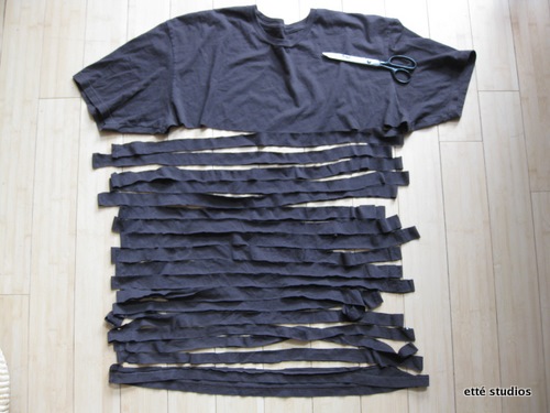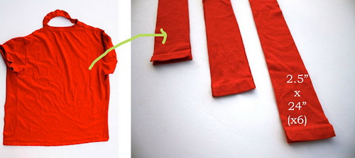 A megmaradt pólóból vágj 6-7 cm széles, minél hosszabb egyforma csíkokat.